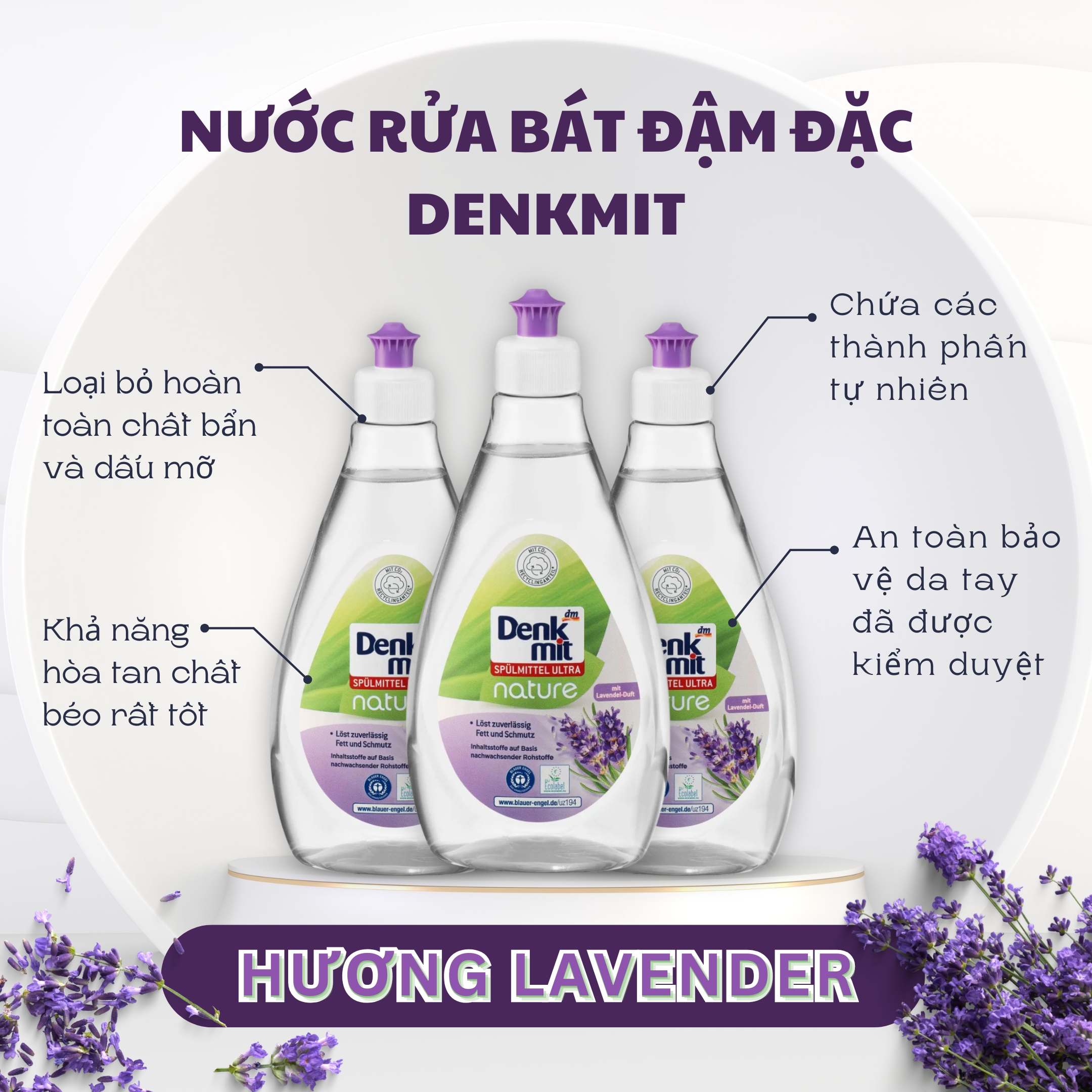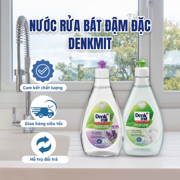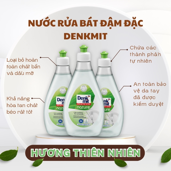 - Nước rửa bát Denkmit loại bỏ vết bẩn với khả năng hòa tan chất béo cao và đảm bảo chén bát sáng bóng.
